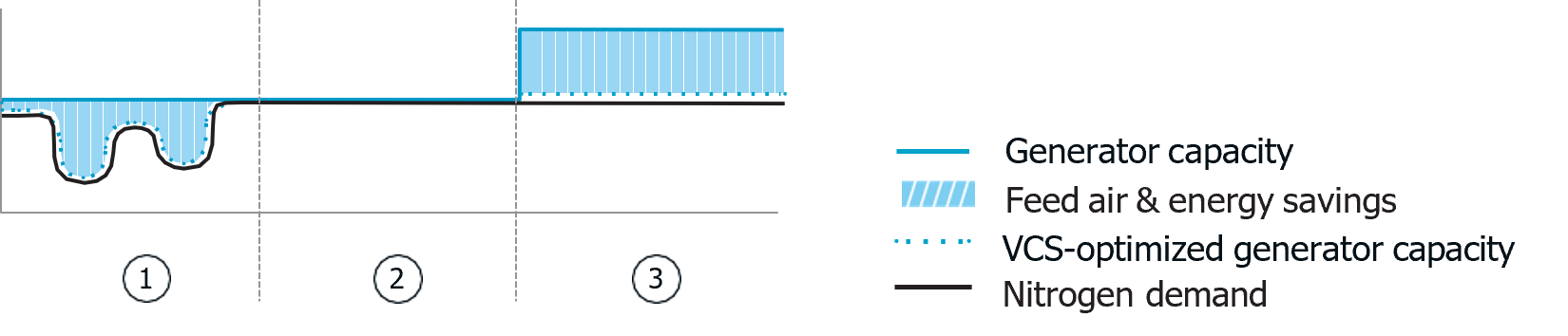 3. Sæsoneffektivitet: Ved fuld belastning under kolde forhold arbejder en nitrogengenerator mere effektivt, hvilket øger dens kapacitet. Her vil VCS’en i NGP+ også træde til for at reducere omkostningerne til fødeluft og energi.