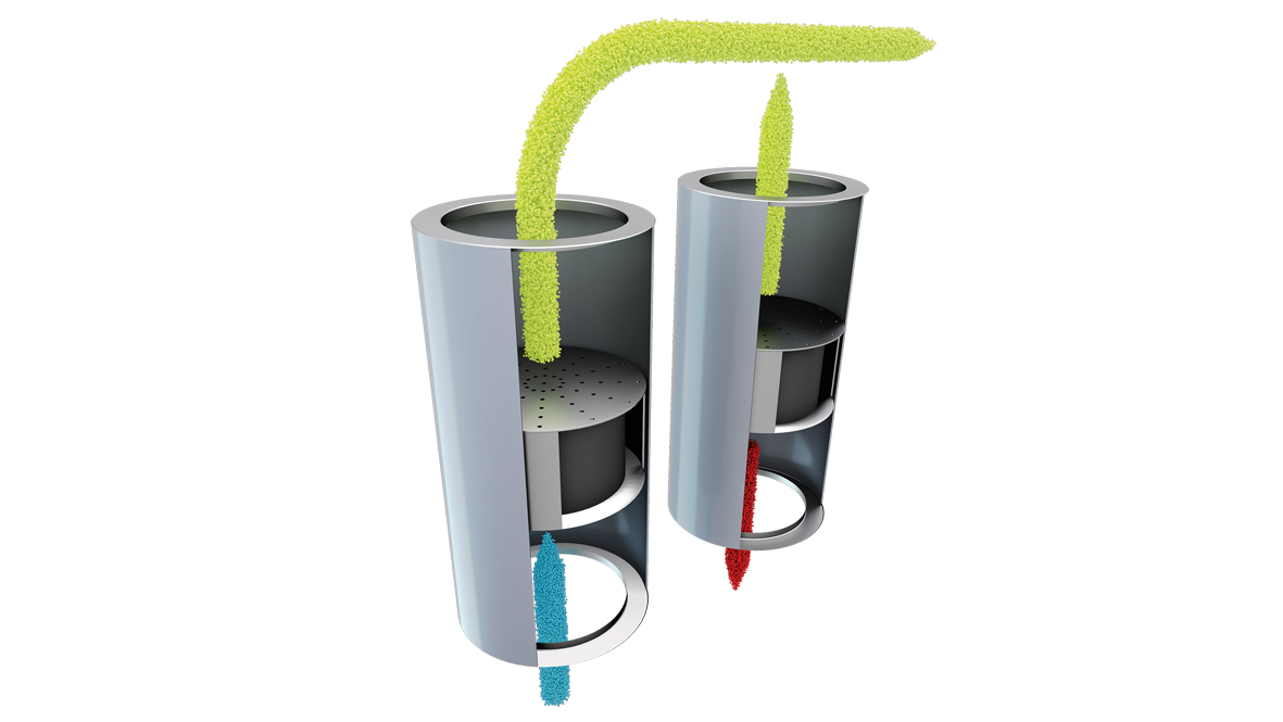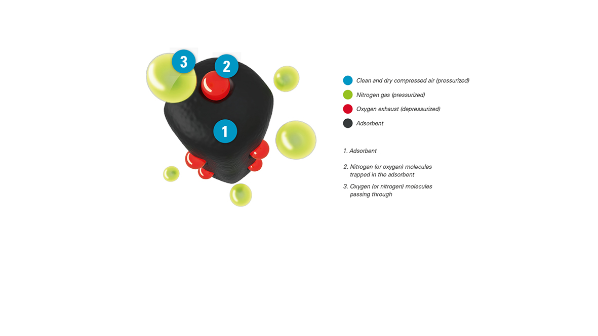 Atlas Copcos NGP/NGP+ nitrogengeneratorer anvender Pressure Swing Adsorption-teknologi til at isolere nitrogenmolekyler fra andre molekyler i trykluft. Ilt, CO2, vanddamp og andre gasser adsorberes. Resultatet er næsten ren nitrogen ved generatorens udgang. NGP/NGP+