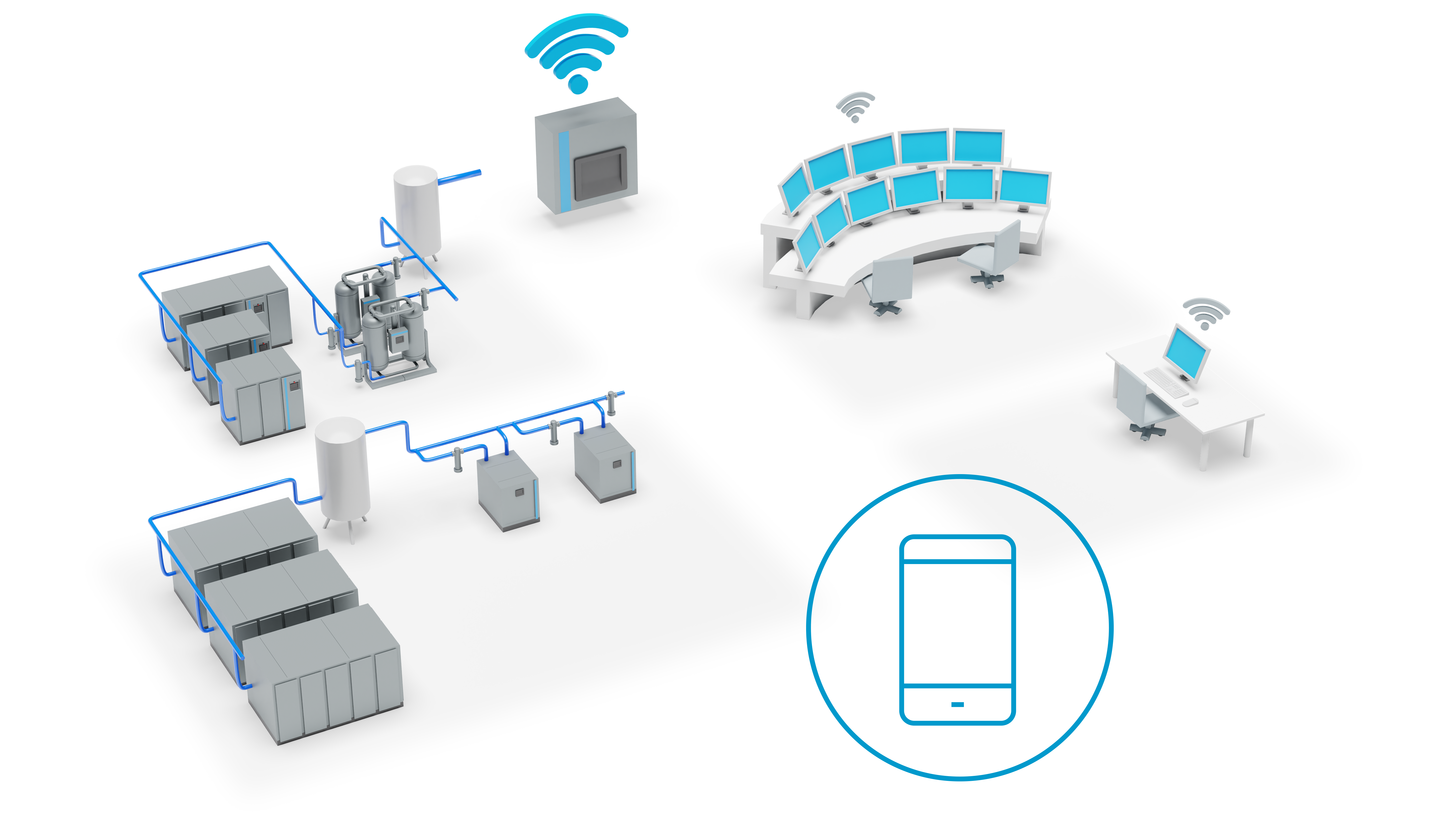 Als uw uitrusting is voorbereid voor het Internet of Things (IoT), kunnen machines in het perslucht- en blowersysteem gegevens verzamelen en verzenden naar uw facilitair beheer voor snellere analyse op maat. Alle machines en uitrusting zijn onderling verbonden en verzenden hun gegevens voortdurend naar een gecentraliseerd SCADA-systeem, DCS of cloudplatform via een beveiligde LAN-netwerk.